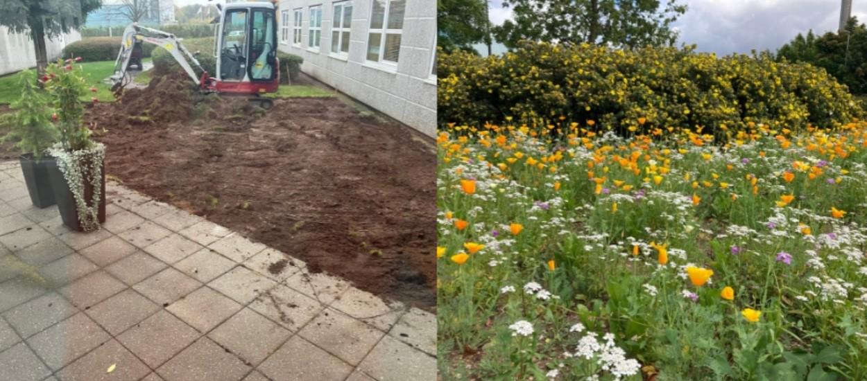 Det samme forventer vi at opleve i den nye blomsterhave, der er anlagt mellem bygningerne, så de kan ses fra kontorerne.