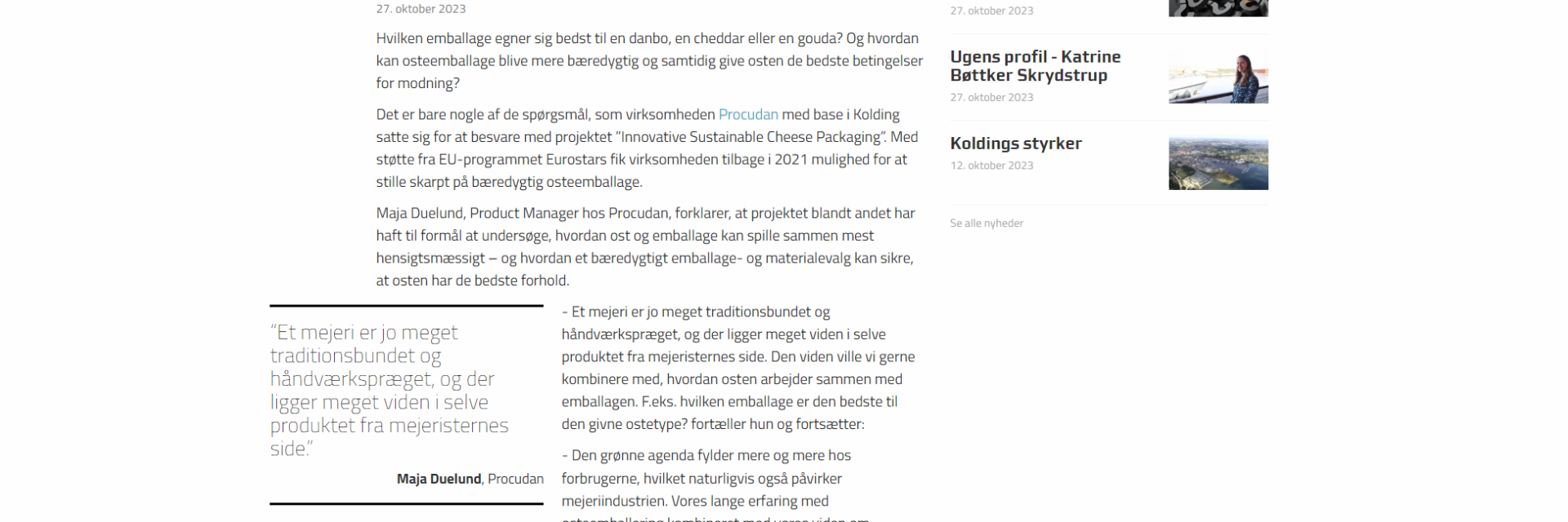 I 2021 fik Kolding-virksomheden Procudan et milliontilskud fra Eurostars-programmet til at undersøge, hvordan man kan optimere osteemballage, så både bæredygtighed og modningsforhold tilgodeses. Et sambesøg med Det Syddanske EU-kontor og Business Kolding var startskuddet for Procudan.